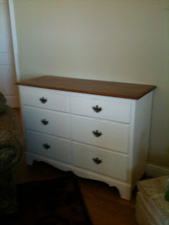 I stripped the top of the dresser, and stained it (Minwax English Chestnut). I then spray painted the bottom (Rustoleum Heirloom White). I thought I would want to find new hardware, but once it was painted, I kind of liked it.